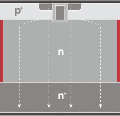 The Legacy 1D MOSFET (left) and RESURF/Superjunction (right). By using alternating n- and p-type columns in the drift region the Superjunction structure reduced RDS(on) without reducing the breakdown voltage but also halved the conduction area