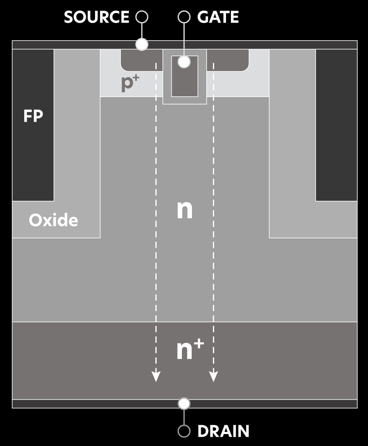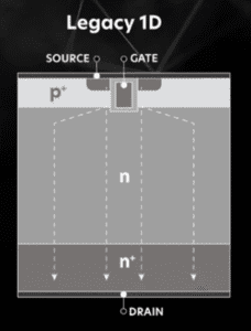 One of the most important breakthroughs in silicon was the introduction of the Superjunction MOSFET, which dramatically improved performance compared to earlier planar designs. However, Superjunction devices are reaching practical limits. Their design constrains conduction area, and further on-state resistance (RDS(on)) reductions often require more complex and costly processing, which can limit their scalability for high-performance applications.