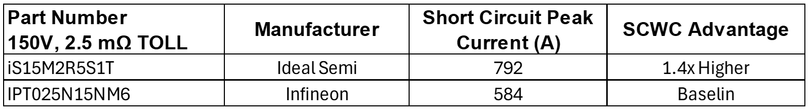 Conventional MOSFETs force designers to compromise between low RDS(on) and rugged short-circuit performance—but SuperQ eliminates this trade-off. In 150V, 2.5mΩ TOLL testing, iDEAL Semiconductor’s iS15M2R5S1T achieved a 792A passing current, outperforming the leading competitor’s 584A by 1.4× as shown in Table 1. This positions SuperQ as the top performer in both short-circuit robustness and conduction efficiency.