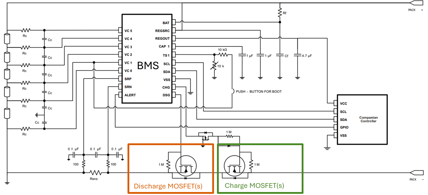 Figure 1: Example battery management system with discharge and charge MOSFETs